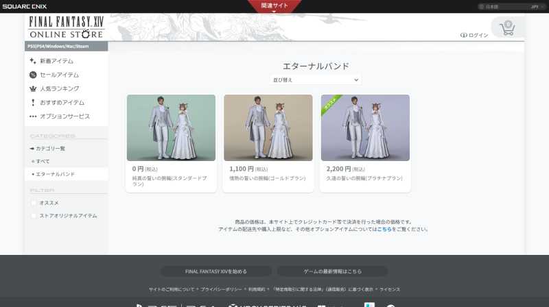 ファイナルファンタジーXIV オンラインストア」にアクセスし、セレモニープランに対応したエターナルバンド用アイテム「誓いの腕輪」を購入します。