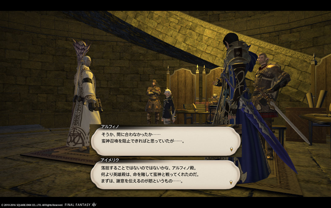 蛮神が出たらケイトが退治するって流れがもうテンプレになっちゃってて召喚阻止が出来なかった事をまず悔やむアルフィノと 近くの蛮神を倒してもらうのを初体験してまずそっちへの礼を伝えようとしてくれるアイメリク様。うんうんどういたしまして