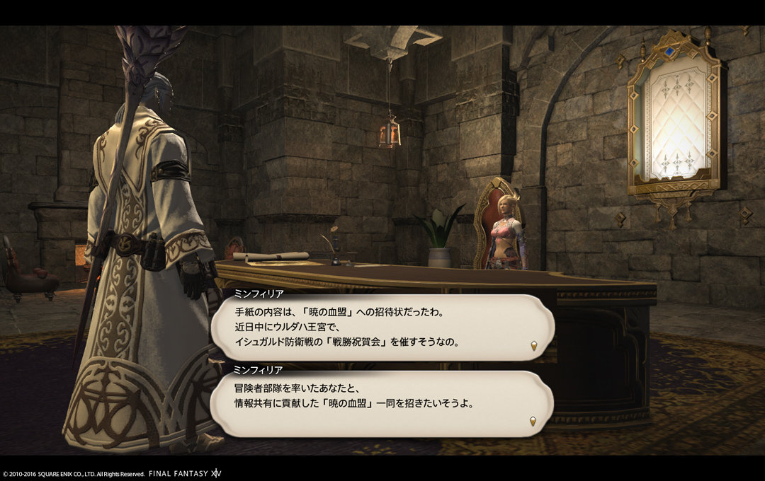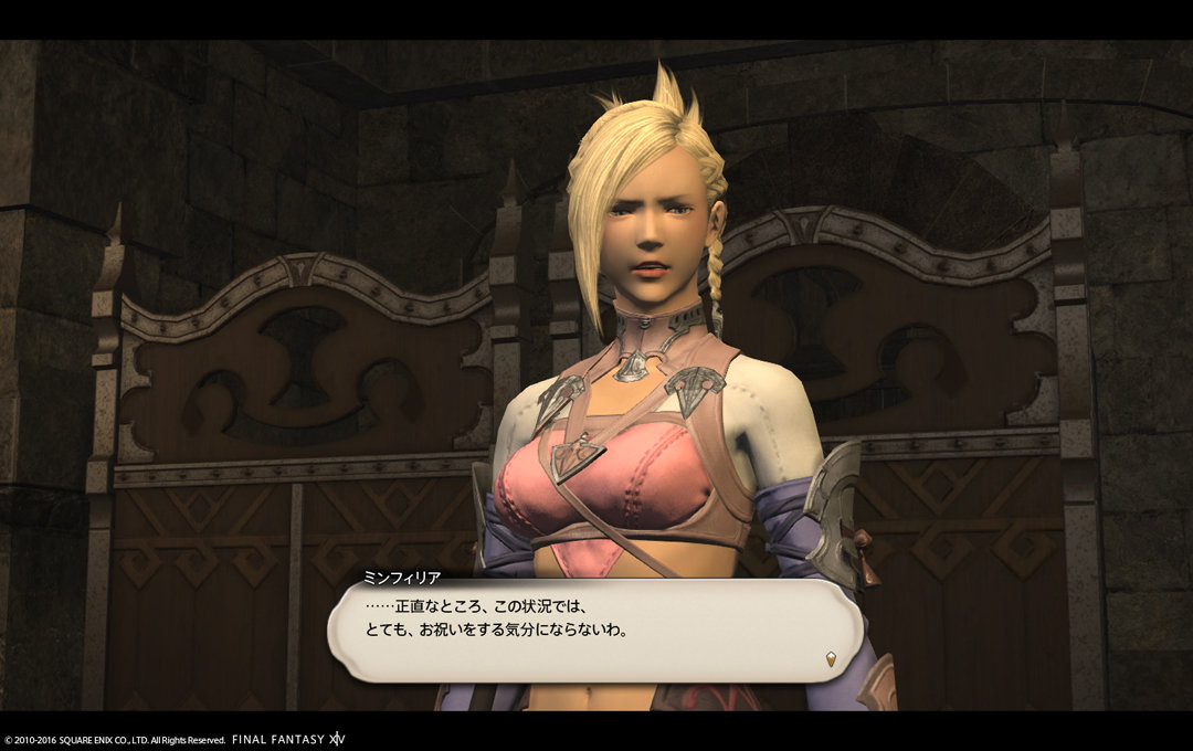 ミンフィリアさんもムーンブリダさんを喪った件からまだ晴れきってないのでお祝いごとの気分じゃないそうですが、エオルゼアの団結を呼びかけてきた手前断るに断れないなあとの事