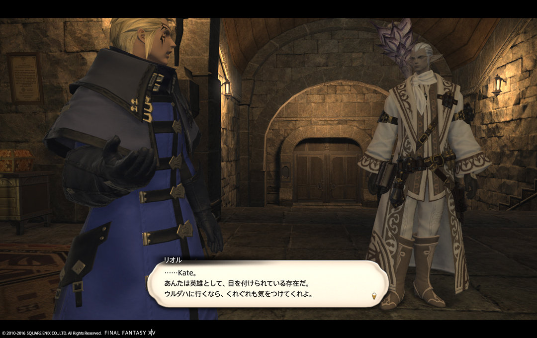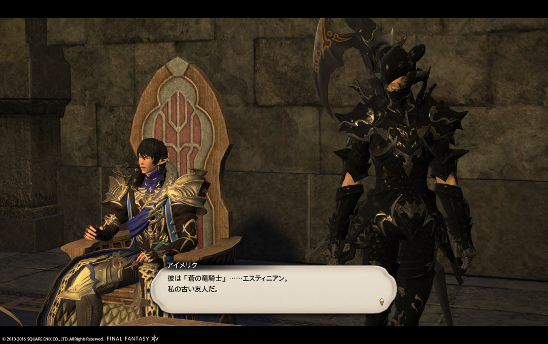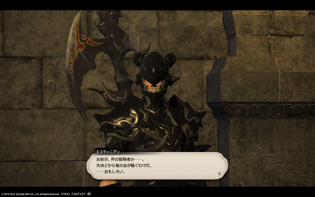 てことは槍術やってジョブが竜騎士だったら、このへんは台詞変わったんだろうな。槍もいつかやってみたいジョブのひとつです。ケイトもエレゼンだし多分似合うからね