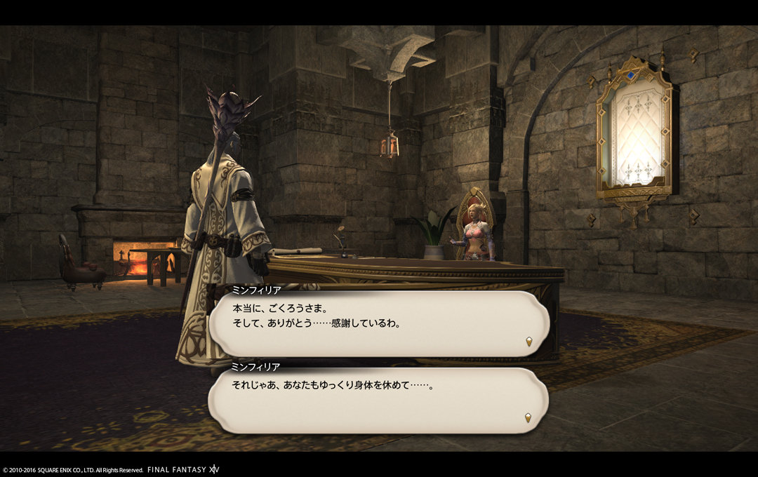 画像を確認する帰宅したヒカセンを気遣ってくれるミンフィリアさん。