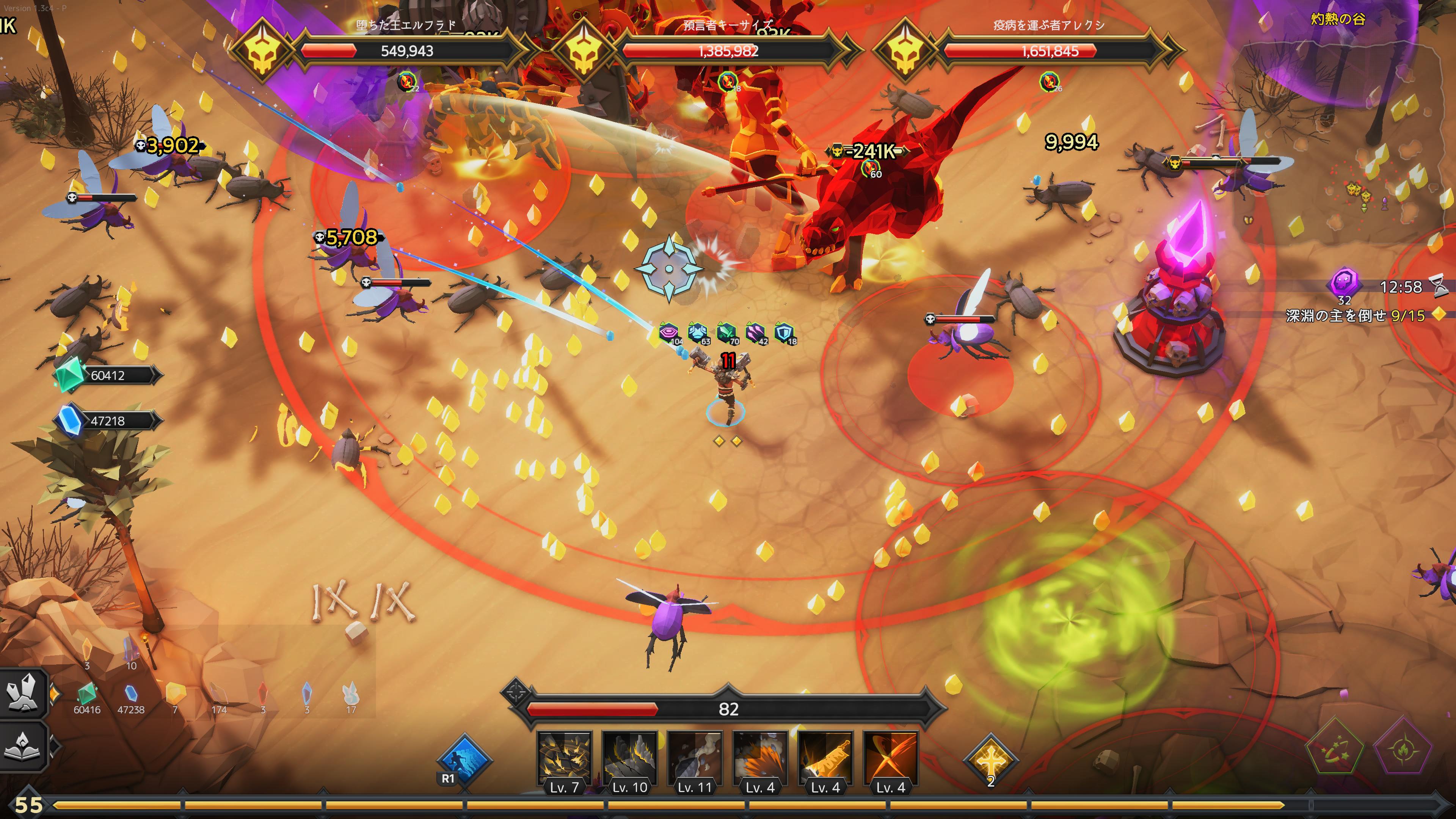 自分のステータスが無限に伸びていくから攻撃範囲を広げれば画面全体に攻撃できるようになったり、マルチ発動を増やせば攻撃スキルを使ったときに同時に2回とか3回発動するから強くなった感が分かりやすいし、逆にステージの難易度(呪い)を上げると敵も強くなってボスが同時に4体出てきたりエリート敵が増えて敵の範囲攻撃の密度がめちゃくちゃ高くなる、最終的にこの画像の3倍くらい予兆が飛んで来て床が赤く染まる