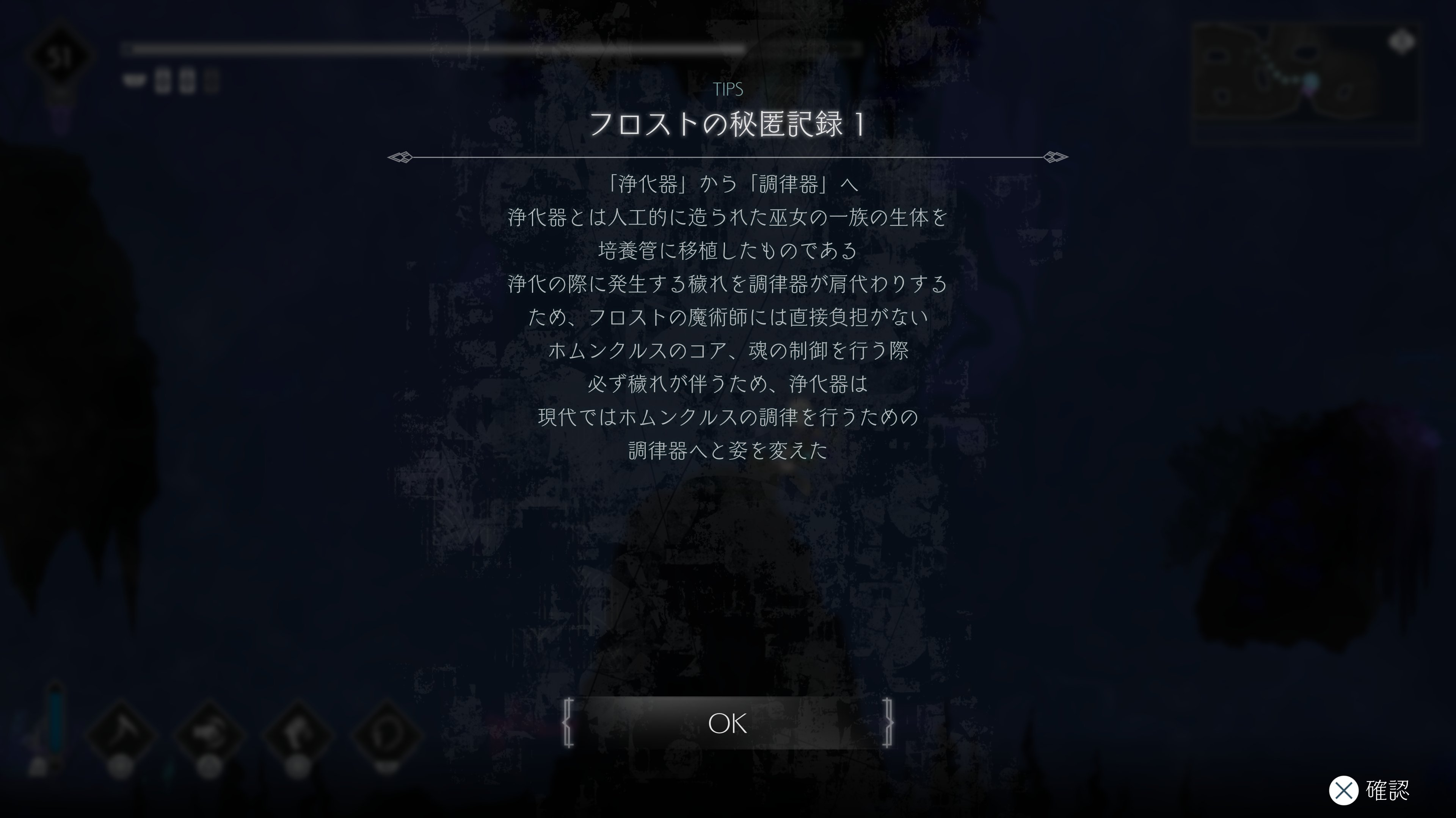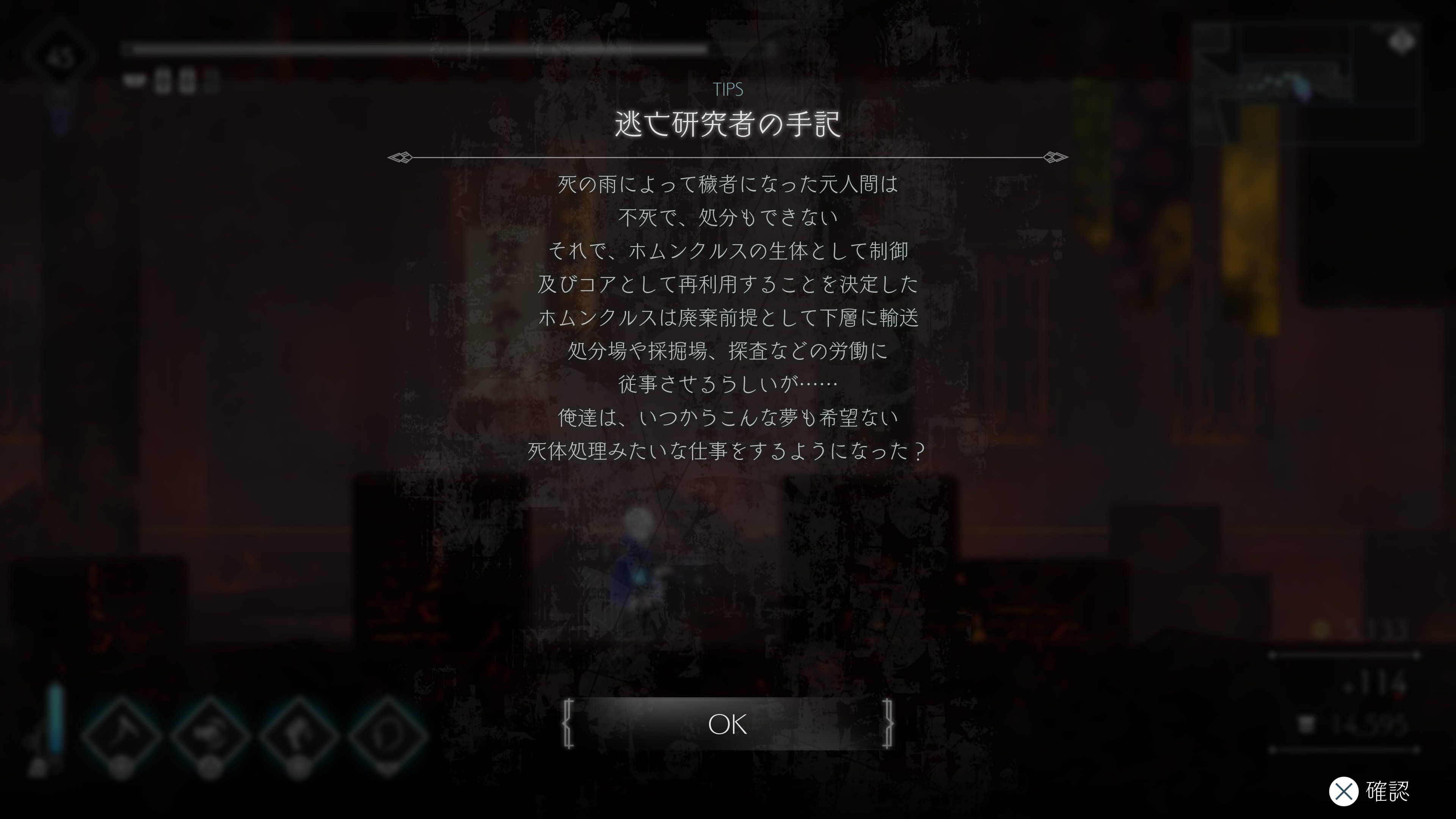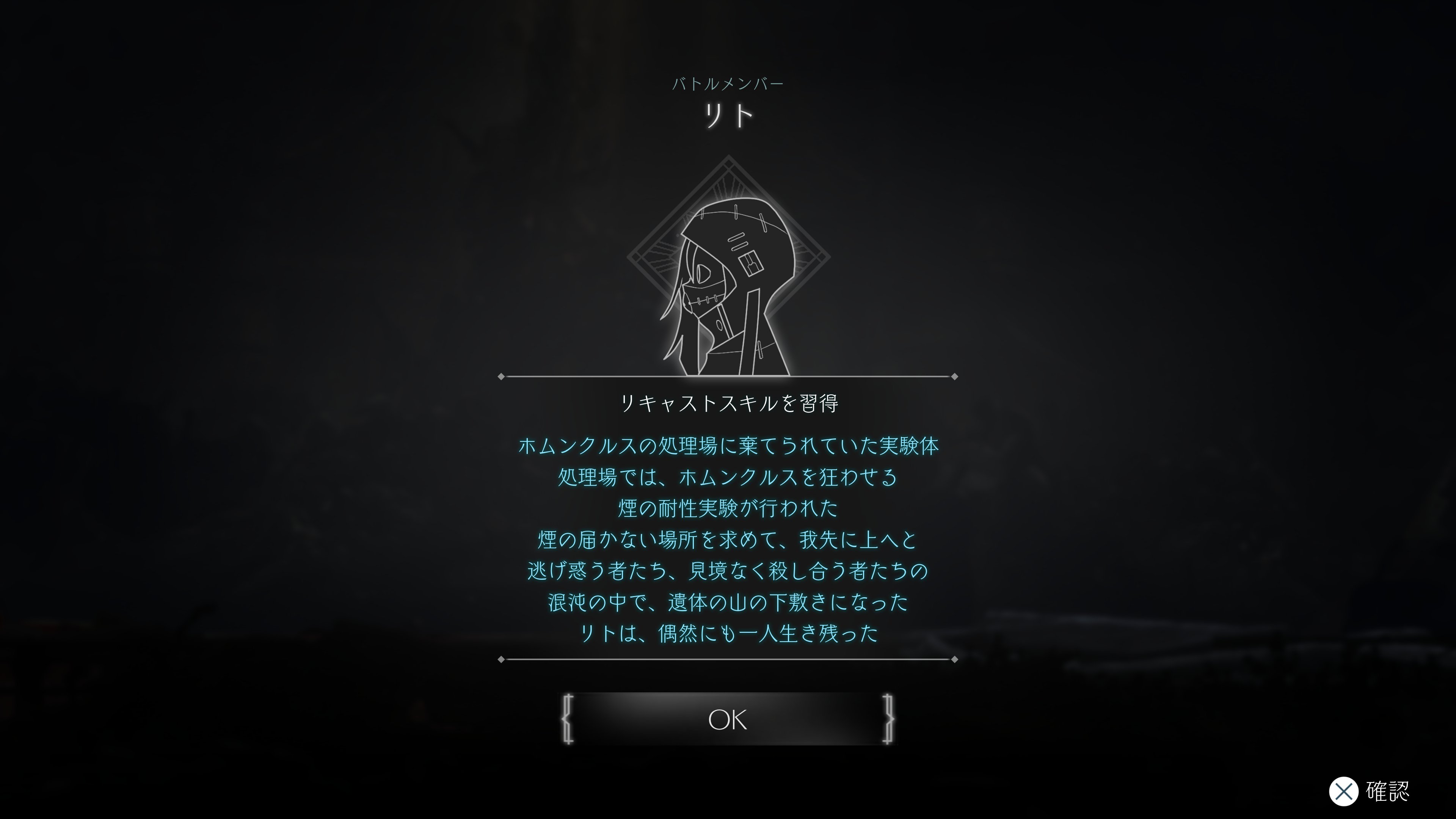 目覚めたのはこの国の下層、人間にもホムンクルスにも有害な煙の影響で狂気に堕ちたホムンクルス(ボス)を倒して、調律師の力で正気に戻して仲間を増やしながらこの国の上層を目指す感じっぽい