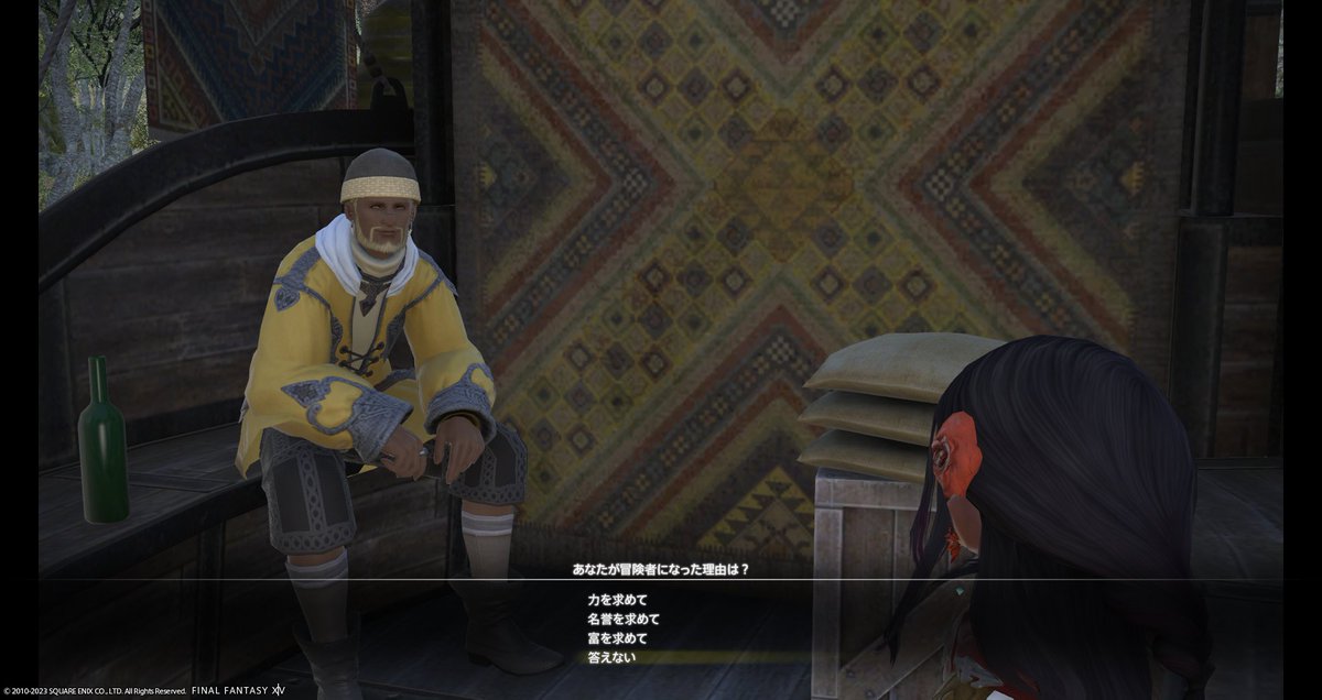 ところでここでおじさんに「どうして冒険者に?」と問われるのですが…、うちの子、(後付けマイ設定ですが)本当はウルダハに出てお針子さんになりたかったのです。それで故郷の東ザナラーンを出てチョコボキャリッジに飛び乗ったのですが、行き先を間違えていたという…。なので力・名誉・富のどれとも答えられないのでした。(設定ができる前でも、やっぱり答えられなかったです。プレイヤーがゲームを始めちゃったから、としか言えなくて)