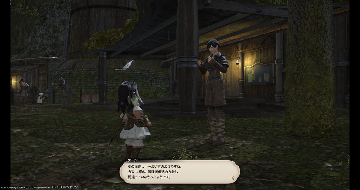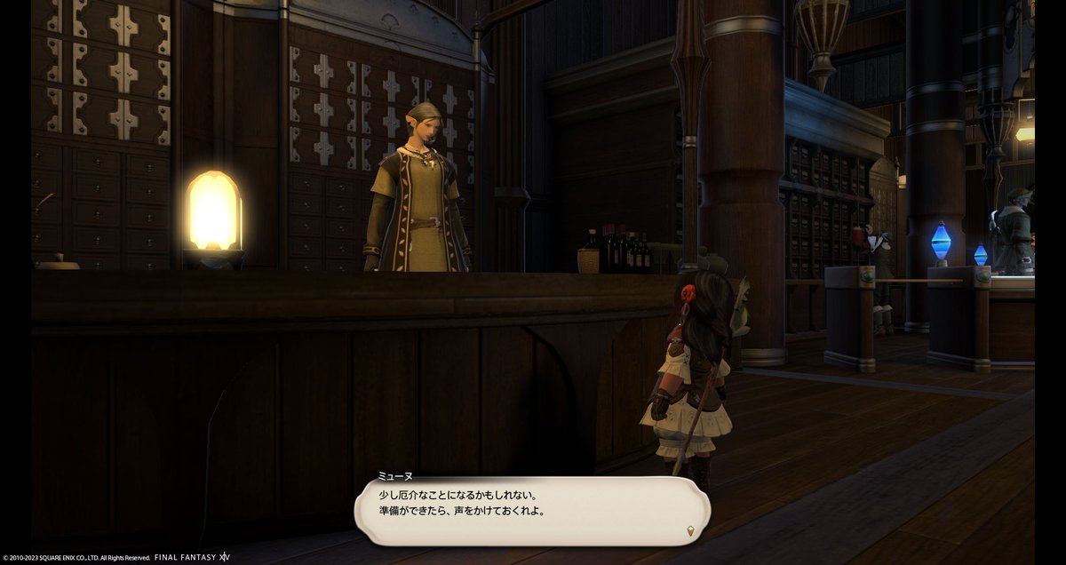 ミューヌさん曰く、イクサル族が長老の木を襲う、そうなったら精霊様が怒る、グリダニアの一大事…とのこと。神勇隊の司令室にミューヌさんからの封書を届けに行きますと、リュウィン司令曰く、例の不審者も絡んでいるかもとのこと。