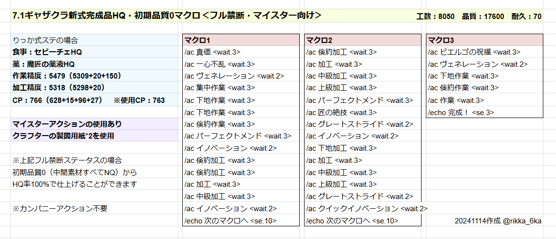 ◆7.1ギャザクラ新式完成品HQ *7.05戦闘新式完成品HQも製作可■装備更新用マクロ2A:7.0IL690装備