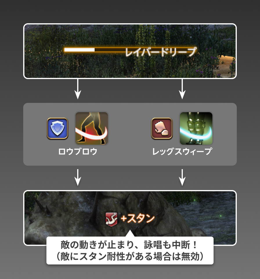 ロウブロウ(タンク)やレッグスウィープ(近接物理DPS)などのアクションで付与できるスタン効果は、敵の動きそのものを止めることができます。そのため、敵にスタン耐性がない限り、キャストバーの色に関わらず、敵の詠唱を中断できます。