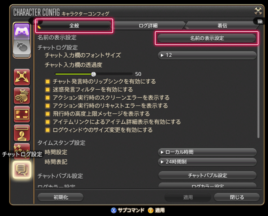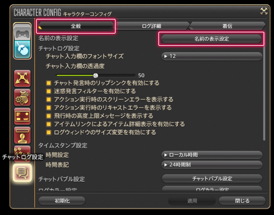 チャットログにクラス・ジョブの省略名を表示するにはまず、メインコマンド>システムメニュー>キャラクターコンフィグ>チャットログ設定>全般タブにある「名前の表示設定」ボタンで「チャットログ:名前の表示設定」ウィンドウを表示しましょう!