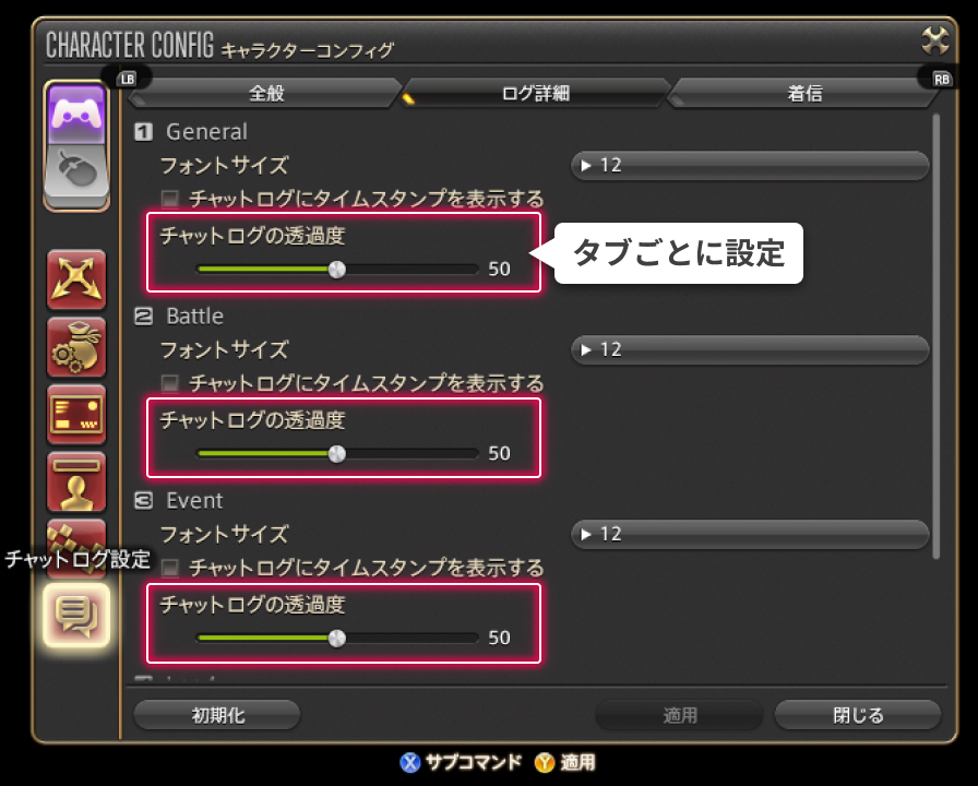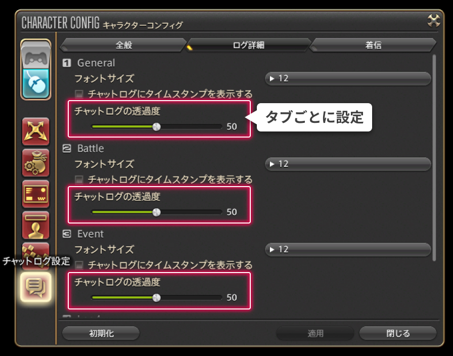 また、タブを分けて表示している場合は、チャットログの透過度を個別に設定できます。
