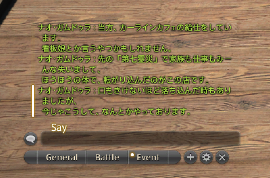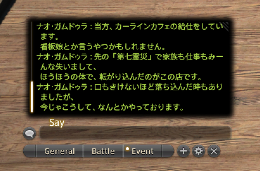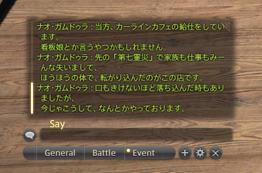 チャットログの透過度を調整したい!そんな時は、メインコマンド>システムメニュー>キャラクターコンフィグ>チャットログ設定>「ログ詳細」タブにある、「チャットログの透過度」のスライダーで調整しましょう!