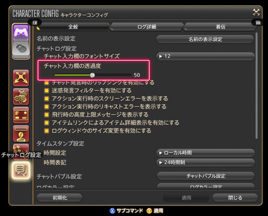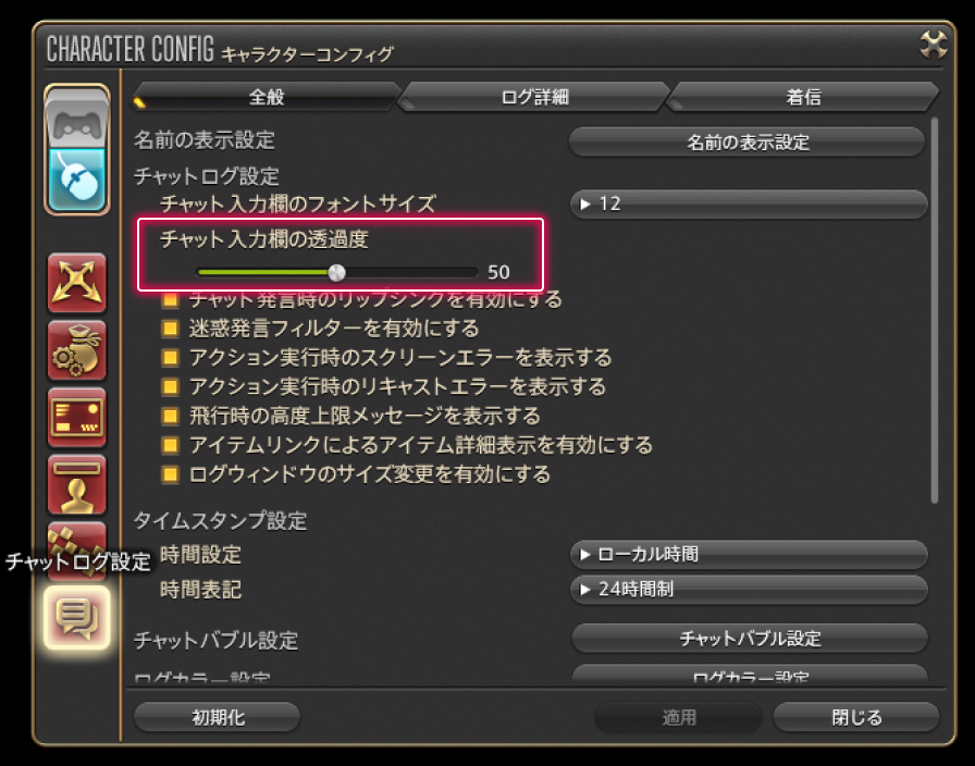 チャット入力欄の透過度は、メインコマンド>システムメニュー>キャラクターコンフィグ>チャットログ設定>「全般」タブにある、「チャット入力欄の透過度」のスライダーで調整できます。