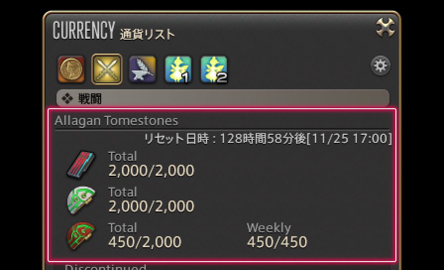 アラガントームストーンの情報は、メインコマンド>マイキャラクター>通貨リストにある「戦闘」タブで確認できます。週制限のリセット日時もここで確認できます。