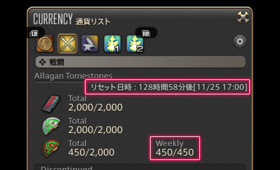 週制限は、一部のアラガントームストーンに設けられている、1週間に取得できる取得上限のことをさします。
