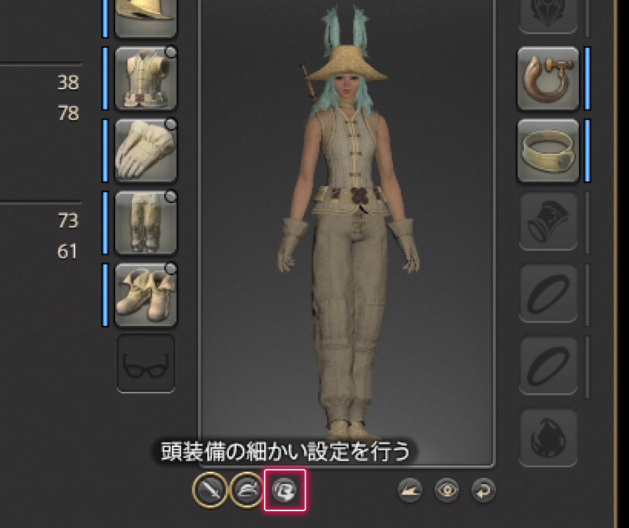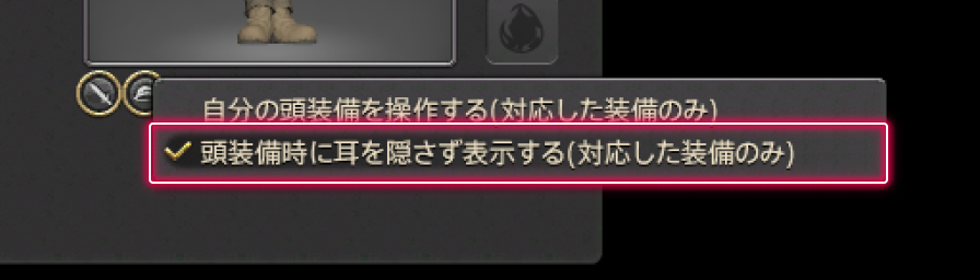 ヴィエラの耳を頭装備と一緒に表示したい!そんな時は、メインコマンド>マイキャラクター下部にある、「頭装備の細かい設定を行う」ボタンから「頭装備時に耳を隠さず表示する」にチェックをいれましょう!