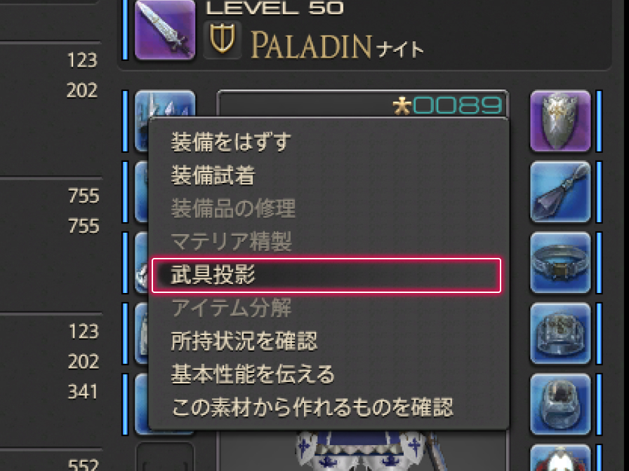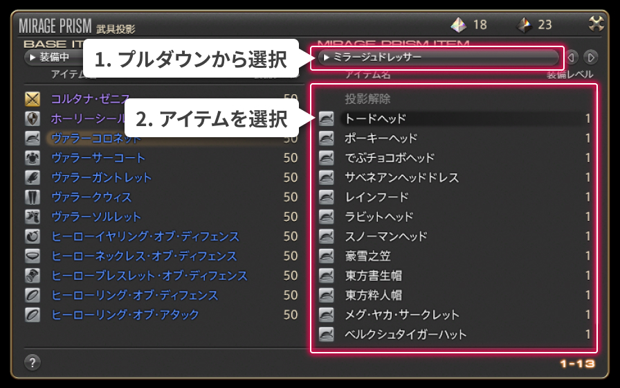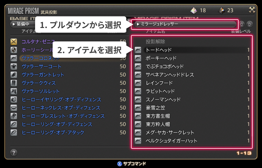 移動後は、アクションリストやサブコマンドなどから武具投影ウィンドウを表示して、右上にあるプルダウンから「ミラージュドレッサー」を選んで、表示されたリストから投影したいアイテムを選択すればOKです。