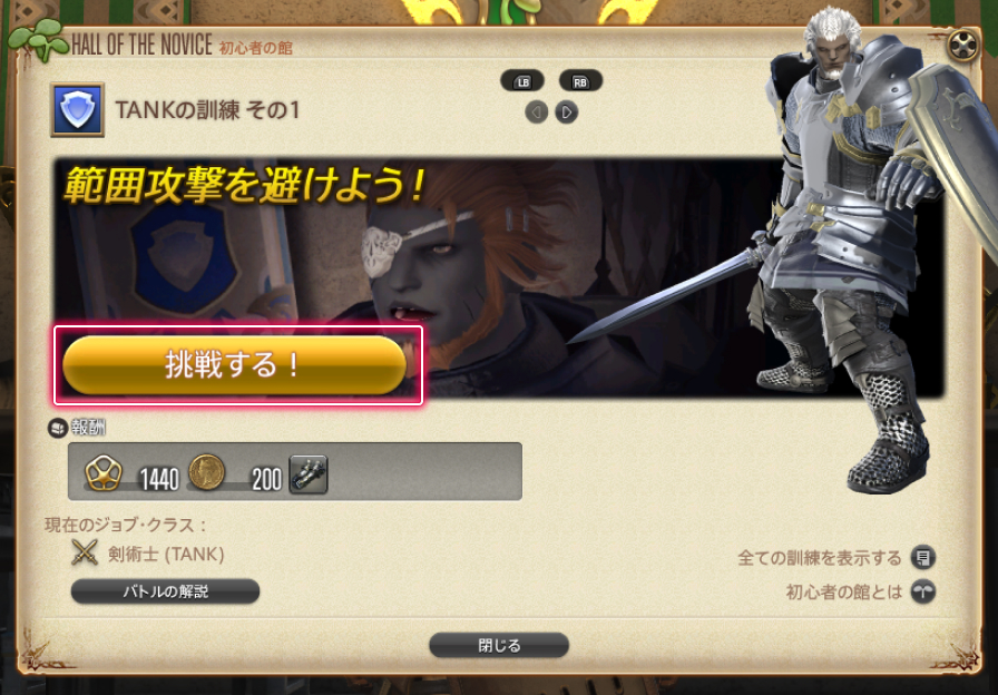 「初心者の館」開放後は、同じNPCからロール(タンク、ヒーラー、DPS)ごとに用意された訓練が受けられますので、受けたいクラスになって話しかけましょう!