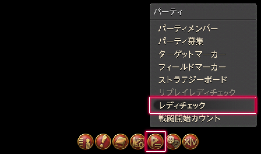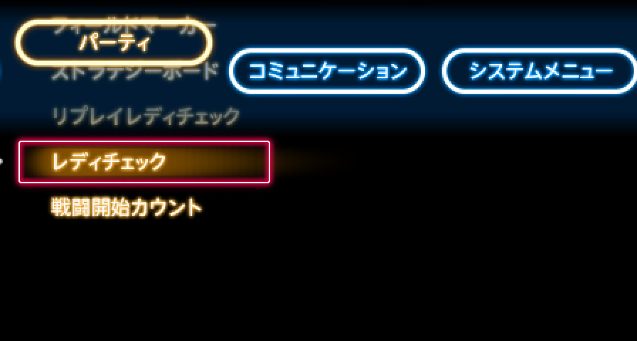 パーティやアライアンスメンバーの準備確認は、メインコマンド>パーティ>レディチェックで行えます。
