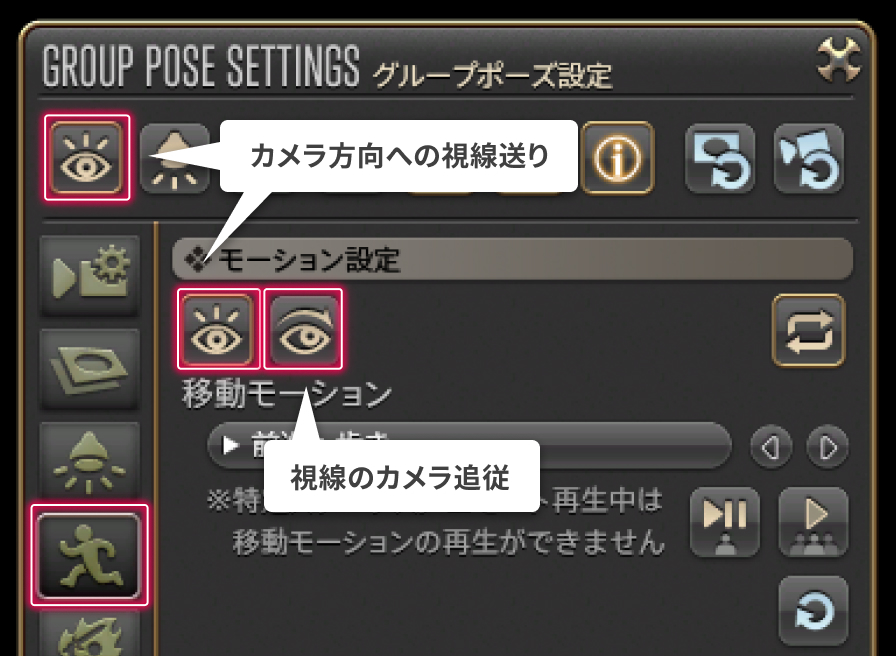 また、グループポーズ設定>モーション設定にある「視線のカメラ追従」ボタンをONにすると、視線のみカメラの動きに追従させることができます。