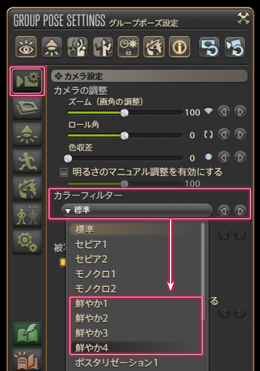 鮮やかな色調のスクリーンショットが撮影したい!そんな時は、グループポーズ設定>全般設定にある「カラーフィルター」で「鮮やか」系のフィルターを選びましょう!