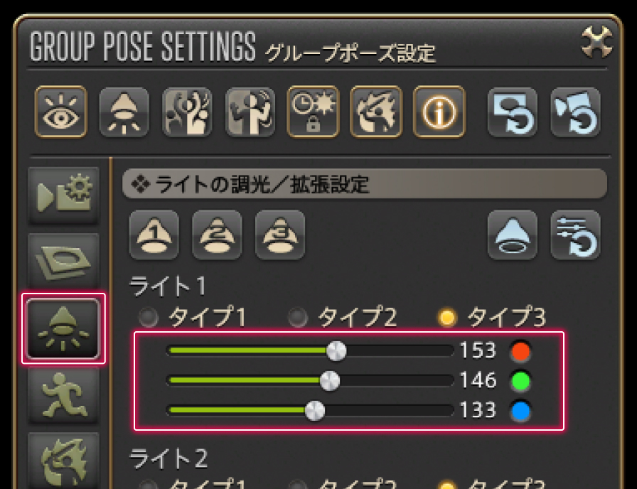 はい。グループポーズで設置できるライトの色は、グループポーズ設定>ライトの調光/拡張設定にある、赤、緑、青のスライダーで変更できます。