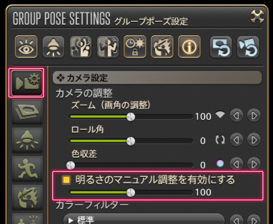 画面全体の明るさを調整したい時は、グループポーズ設定>全般設定にある「明るさのマニュアル調整を有効にする」のチェックボックスをONにして、下にあるスライダーで調整する方法がオススメ!