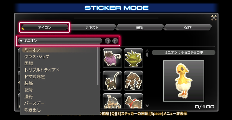 ミニオンや調理品、装飾系、吹き出しなどのステッカーは「アイコン」タブを、テキスト系のステッカーは「テキスト」タブを選択しましょう!