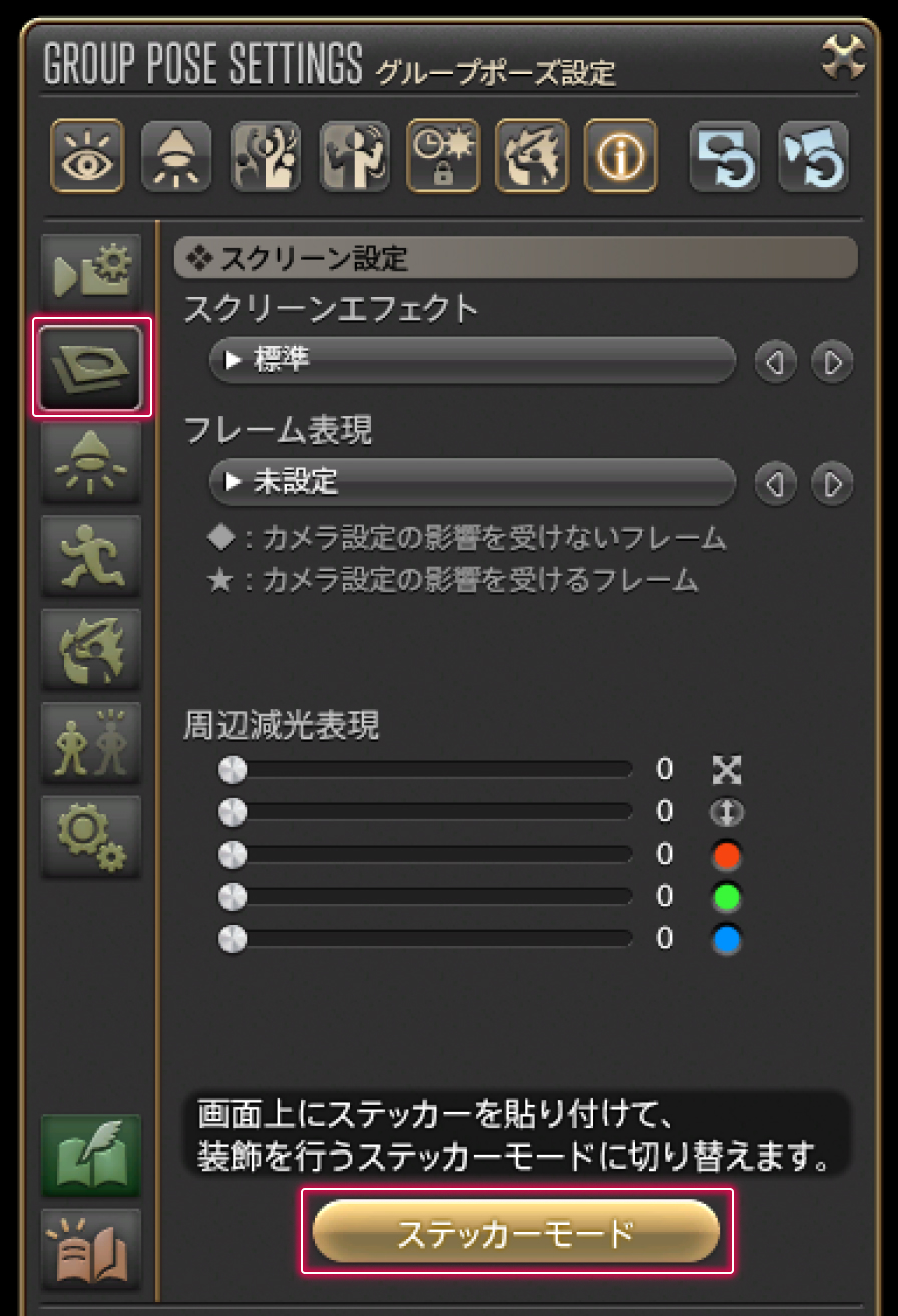 グループポーズ設定>エフェクト/フレーム表現設定にある「ステッカーモード」ボタンを選択し、ステッカーモードを起動します。