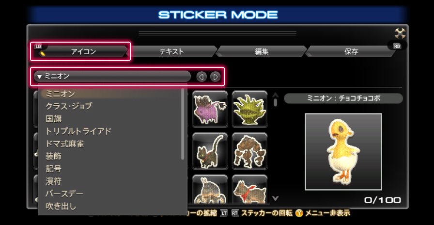 「アイコン」または「テキスト」タブを選択し、上部にあるプルダウンから、貼りたいステッカーのカテゴリを選択します。